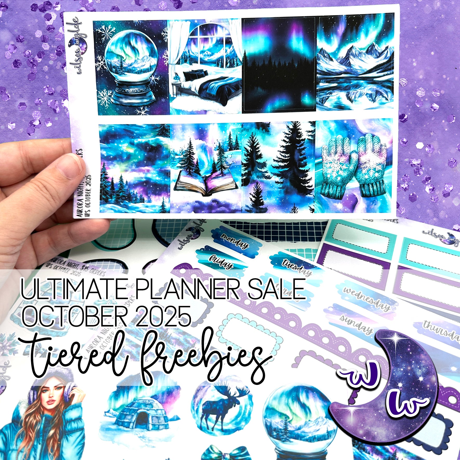 Aurora Night, tiered freebie kit, standard vertical format. 8 planner sticker sheets, includes deco, full and appointment boxes.