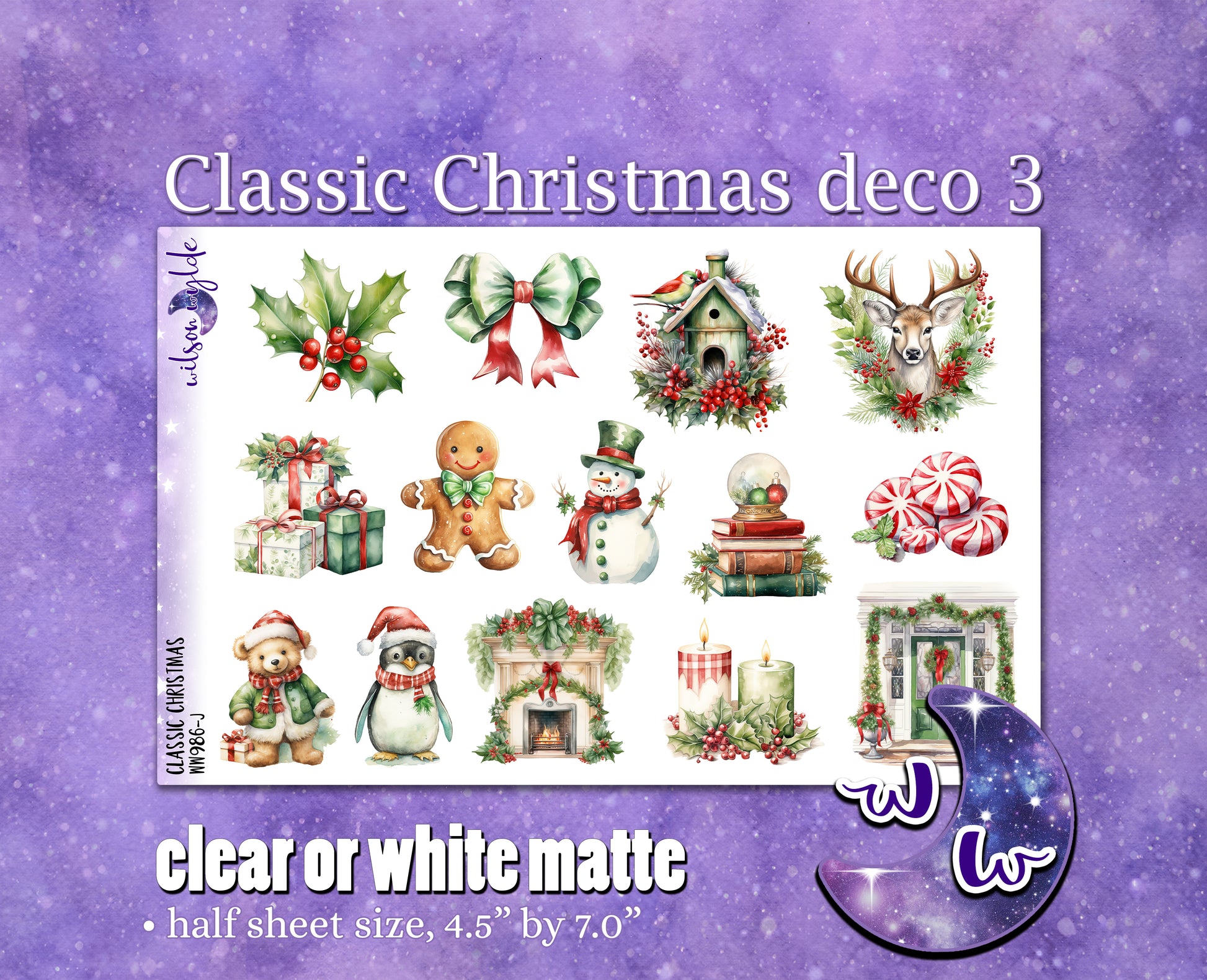 Classic Christmas deco 3 planner stickers, Matte or frosted clear. WW986
