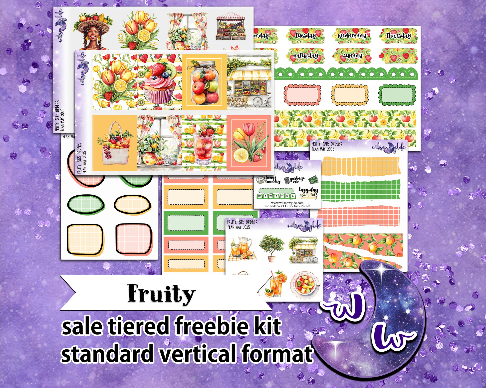 Fruity, tiered freebie kit, standard vertical format. 8 planner sticker sheets, includes deco, full and appointment boxes.