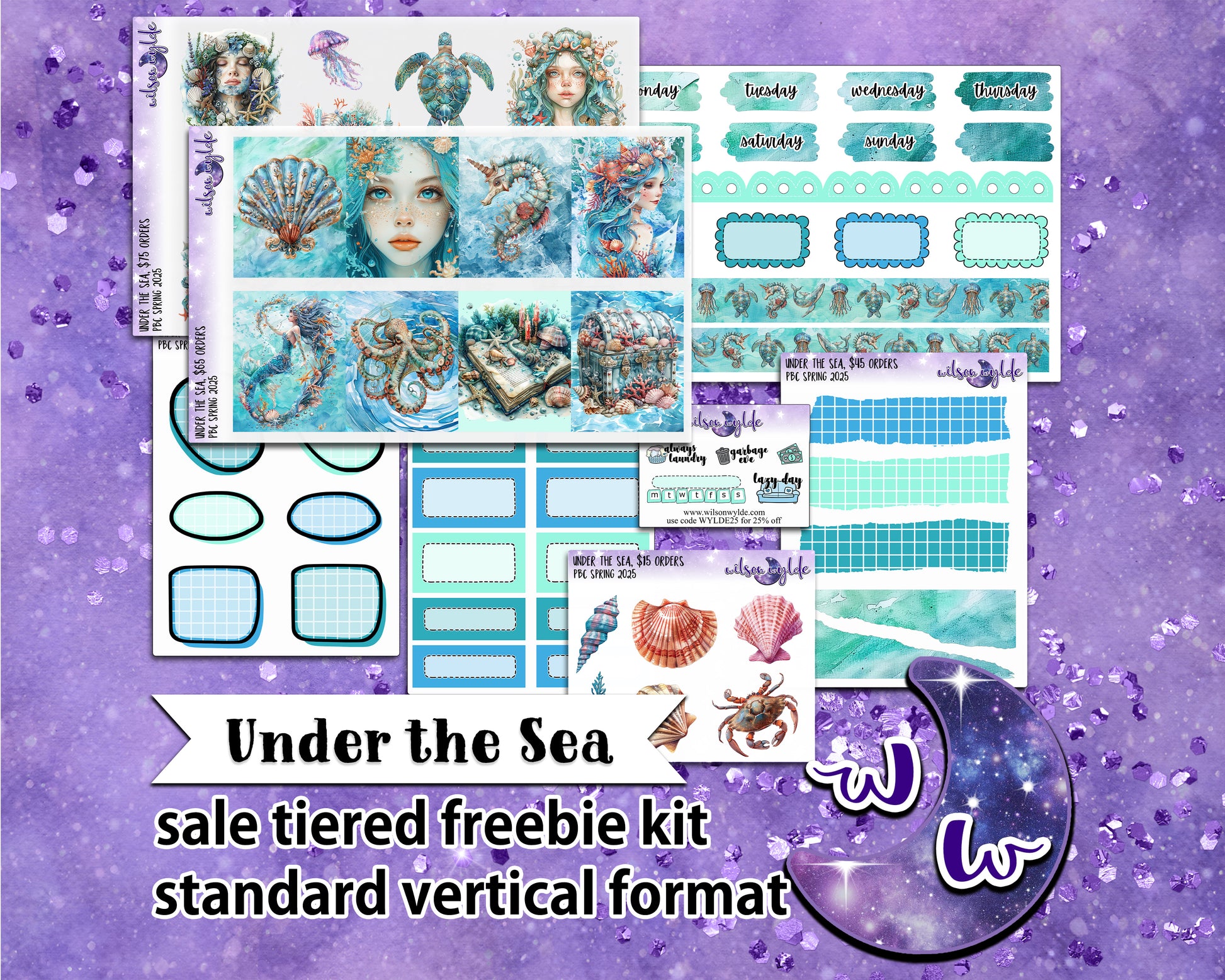 Under the Sea, tiered freebie kit, standard vertical format. 8 planner sticker sheets, includes deco, full and appointment boxes.